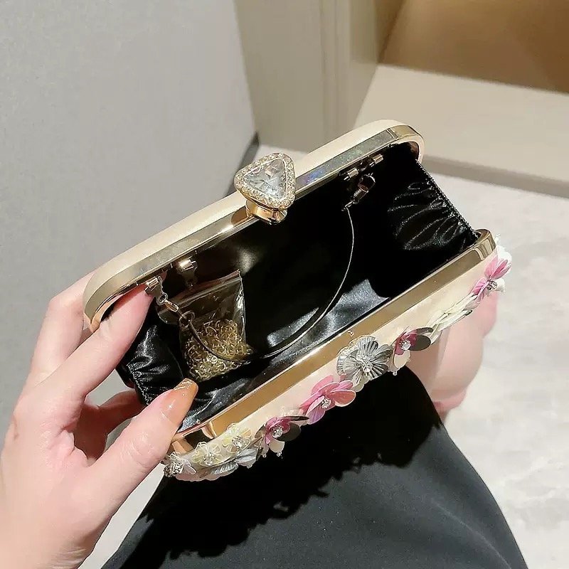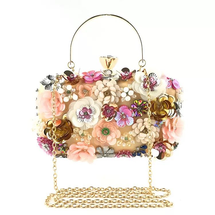Each clutch features intricately layered flowers in soft pink, ivory, gold, and crystal tones, creating a rich, elegant texture that instantly elevates your outfit.